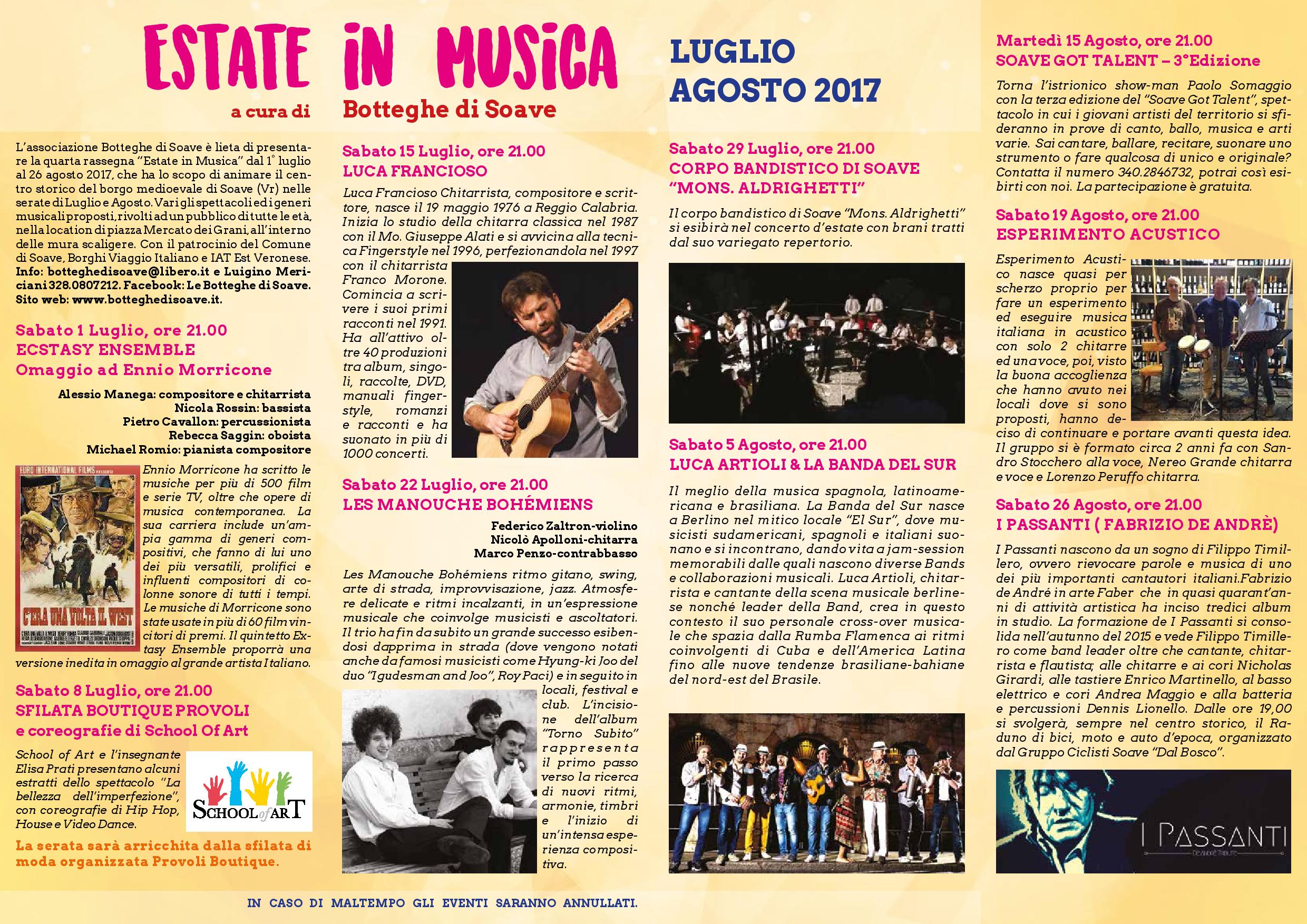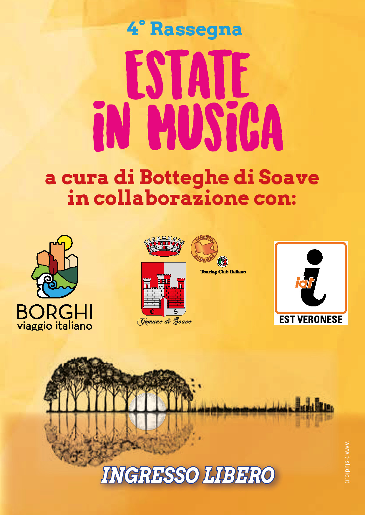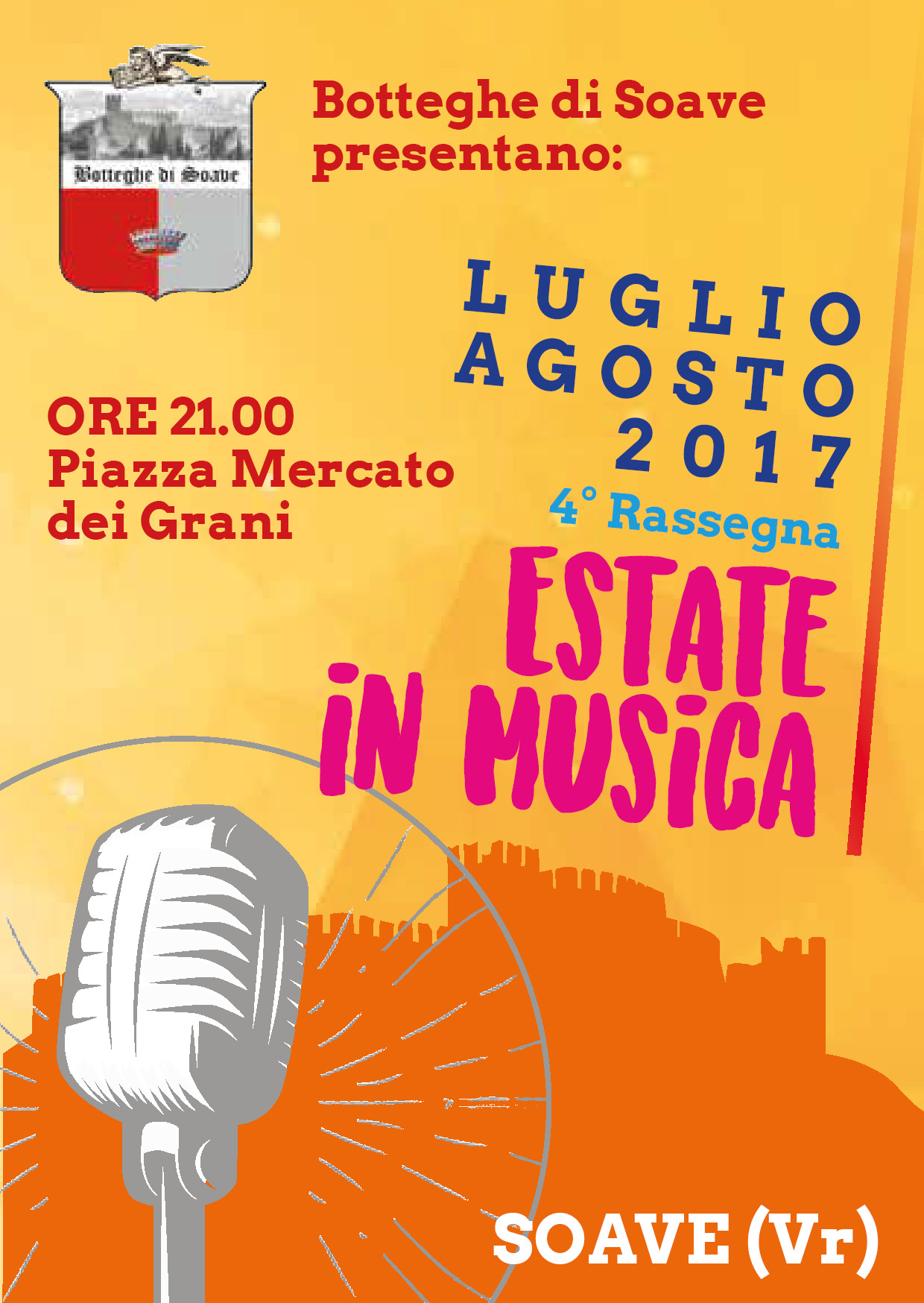 L'associazione Botteghe di Soave è lieta di presentare la quarta rassegna “Estate in Musica” dal 1° luglio al 26 agosto 2017, che ha lo scopo di animare il centro storico del borgo medioevale di Soave (Vr) nelle serate di Luglio e Agosto. Vari gli spettacoli ed i generi musicali proposti, rivolti ad un pubblico di tutte le età, nella location di piazza Mercato dei Grani, all’interno delle mura scaligere.Tutti gli eventi avranno inizio alle ore 21,00, sono gratuiti ed in caso di maltempo saranno annullati.