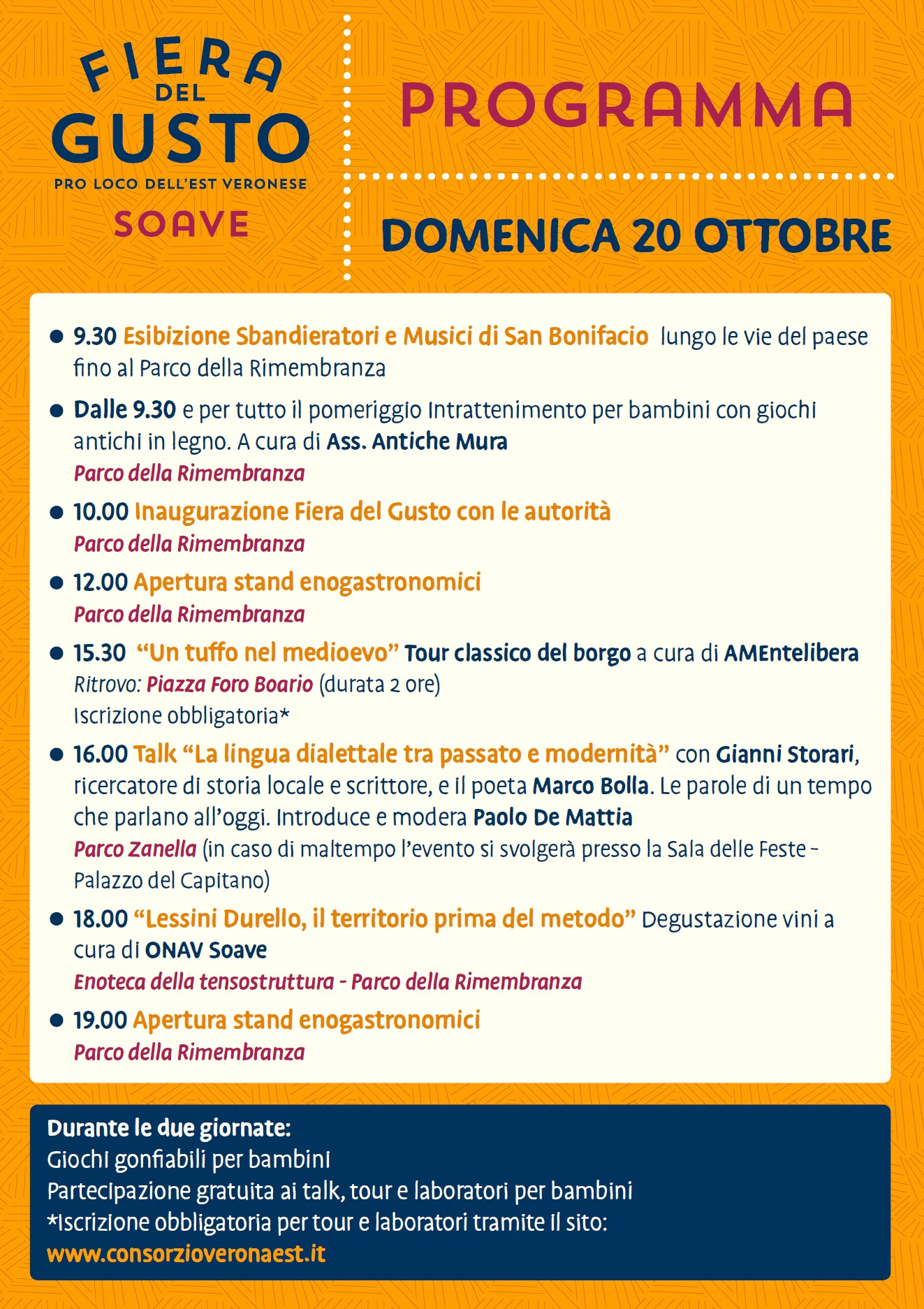 La Fiera del Gusto di Soave torna per la sua ottava edizione il 19 e 20 ottobre 2024, offrendo un weekend ricco di sapori, cultura e tradizioni del territorio veronese a cura delle Pro Loco del Verona Est. Quest'anno, l'evento si arricchisce ulteriormente con la rassegna "Radici e Percorsi", organizzata in occasione dell'Anno del Turismo delle Radici lanciato dal Ministero degli Esteri.